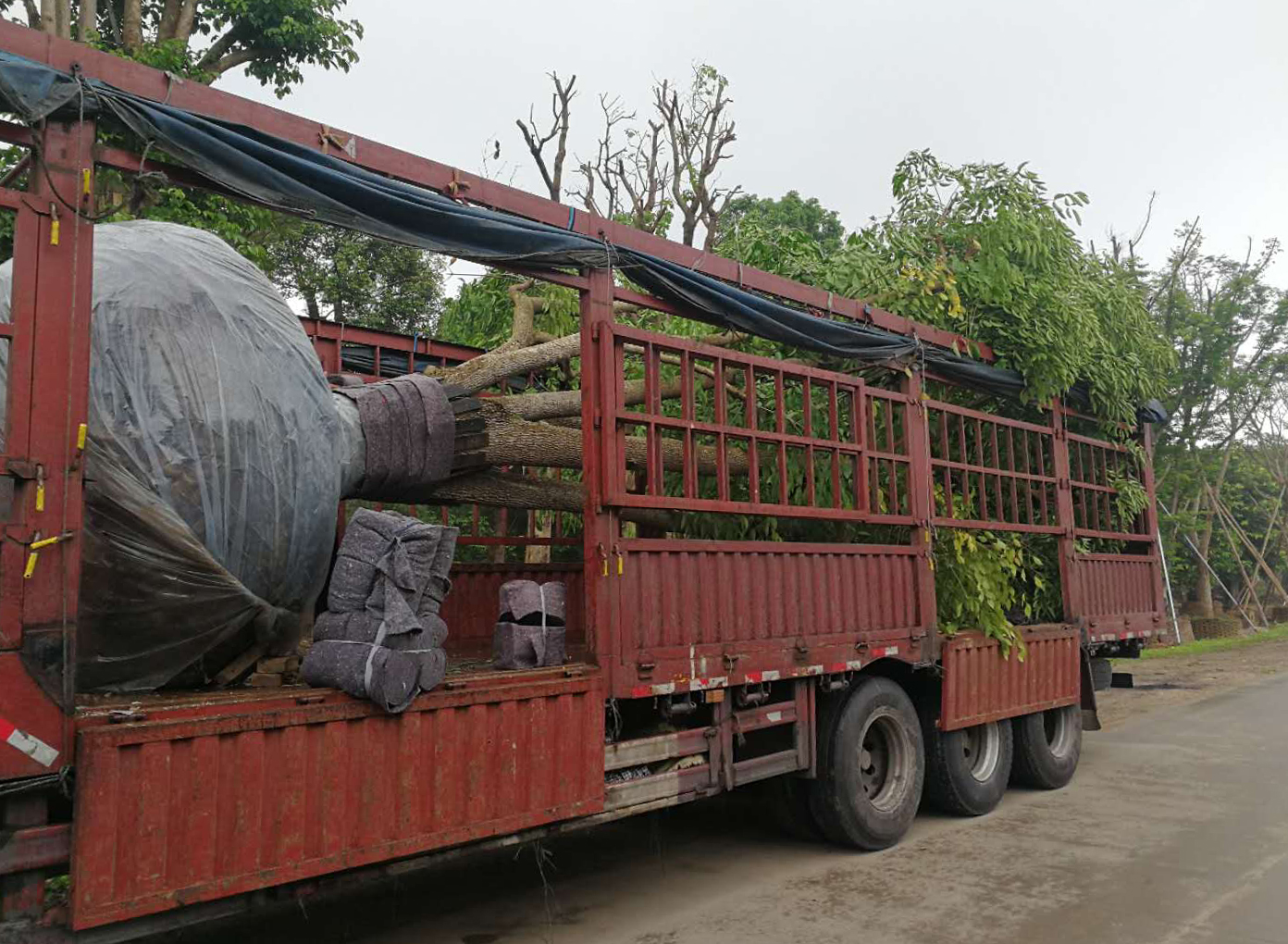 項目團隊對6棵大樹進行了專業的保護。在起苗時,嚴格把控土球大小,按規范進行斷根,最大限度地保護苗木根系并保證土球的完整性。同時針對不同規格苗木,采用不同邊板高度的運輸車,注重運輸安全,保證大樹樹冠的整體性。采用透氣、保濕的包裝材料進行包裝,起運前噴施殺菌劑、抗蒸騰劑。運輸途中押運員隨時檢查苗木情況,定時通風補水,確保苗木完好無損。大樹吊栽前,項目施工人員先在樹池內放置固定的鋼架、鋪設透氣的陶粒,再填入自主研發的種植土,能夠有效提高透氣、透水性,增強保水、保肥能力,明顯改善植物根系的生長環境,促使植物根系發達,枝繁葉茂,青蔥翠綠。